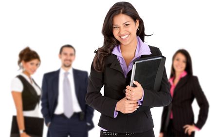 Smiley business woman with a group behind her, isolated