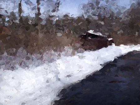 Snowy road to a public park outhouse in winter, in the style of French impressionist Claude Monet
