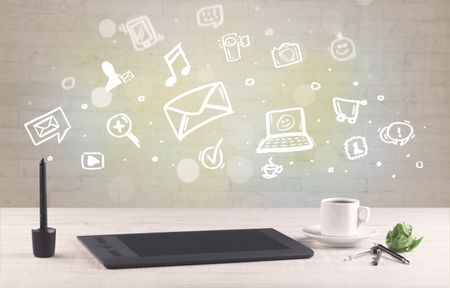 Social media online communication concept with icons and close up of business office desk full of work equipement