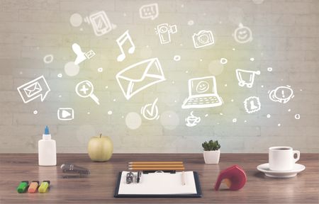 Social media online communication concept with icons and close up of business office desk full of work equipement