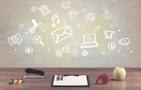 Social media online communication concept with icons and close up of business office desk full of work equipement