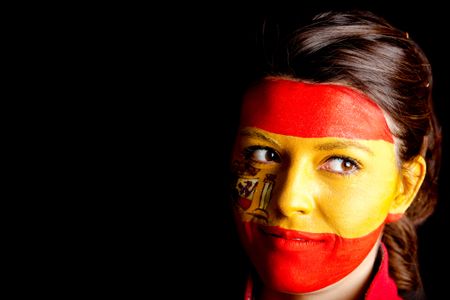 Spanish woman with the flag painted on her face ? isolated over a black background