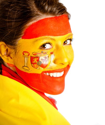 Spanish woman with the flag painted on her face ? isolated over a white background
