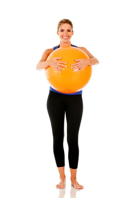 Sportive woman with a pilates ball - isolated over white