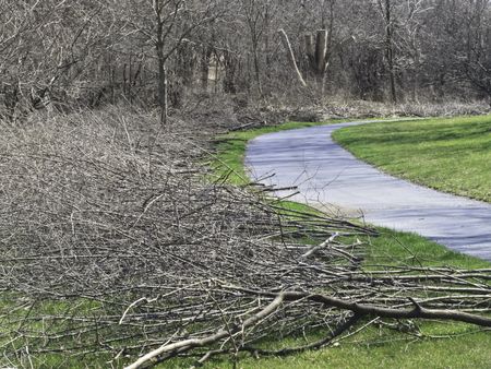 Spring cuttings: Piles of pruned tree branches arranged for pickup along curved path by woods in a public park, northern Illinois
