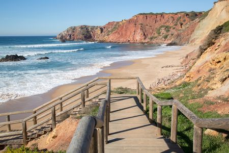 Stairs down to Amado Beach with Cliffs in the Algarve; Portugal