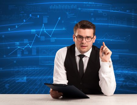 Stock data analyst in studio giving adivce on blue chart background concept on background