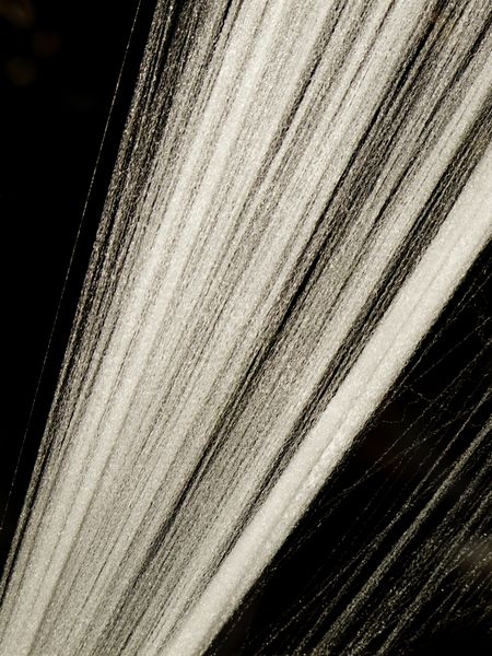 Strands of artificial web, part of Halloween installation, like rays of light against a dark background