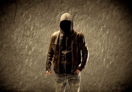 A strange suspicious confident hacker standing with a hoodie and leather jacket in front of sepia brown urban concrete wall concept