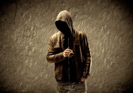 A strange suspicious confident hacker standing with a hoodie and leather jacket in front of sepia brown urban concrete wall concept