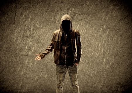 A strange suspicious confident hacker standing with a hoodie and leather jacket in front of sepia brown urban concrete wall concept