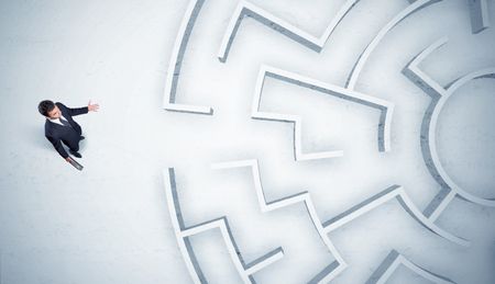 Stressful business man looking at circular maze with nowhere to go