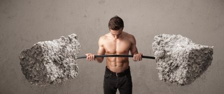Strong muscular man lifting large rock stone weights