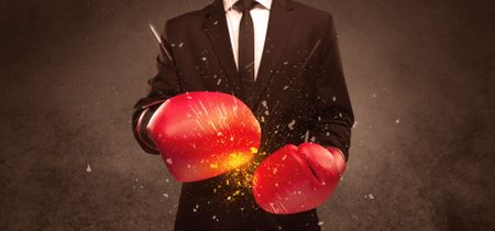 A strong sales person breaking something into pieces with red boxing gloves concept illustrated with glowing residue flying in the air.