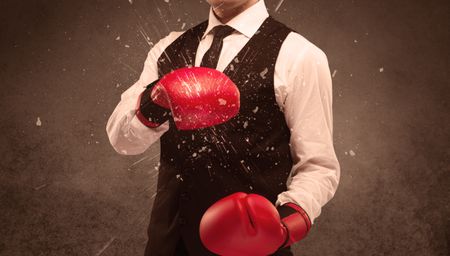 A strong sales person breaking something into pieces with red boxing gloves concept illustrated with glowing residue flying in the air.