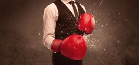 A strong sales person breaking something into pieces with red boxing gloves concept illustrated with glowing residue flying in the air.
