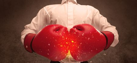 A strong sales person breaking something into pieces with red boxing gloves concept illustrated with glowing residue flying in the air.