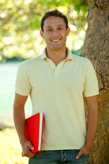 Student with a notebook next to a tree outdoors