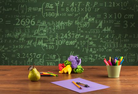 A stuffed school desk with green blackboard in the background full of numbers, calculation