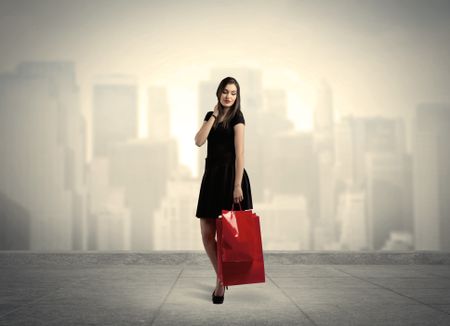 A stylish female standing with red shopping bags on platform and city view landscape backround concept