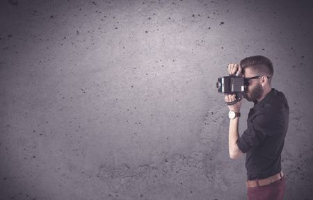 A stylish funny hipster person holding a vintage camera and taking photographs in front of a concrete clear empty urban wall background concept