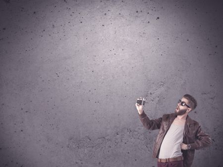 A stylish funny hipster person holding a vintage camera and taking photographs in front of a concrete clear empty urban wall background concept