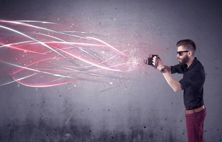 A stylish funny hipster person holding a vintage camera and taking photographs illustrated with glowing red, white lines concept