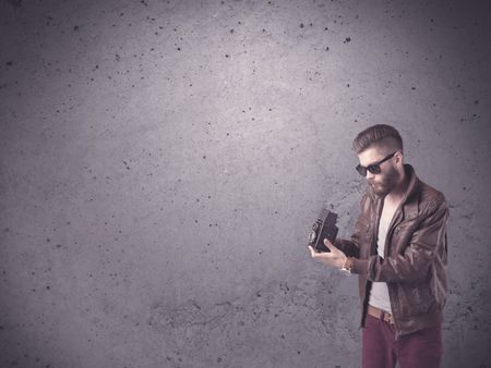 A stylish funny hipster person holding a vintage camera and taking photographs in front of a concrete clear empty urban wall background concept