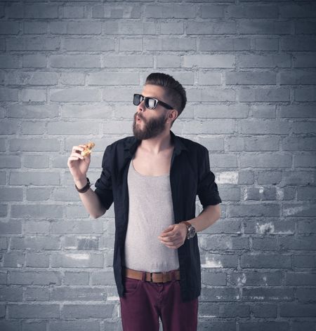 A stylish hipster guy with beard and sunglasses standing in casual clothes in front of an urban blue brick wall background concept
