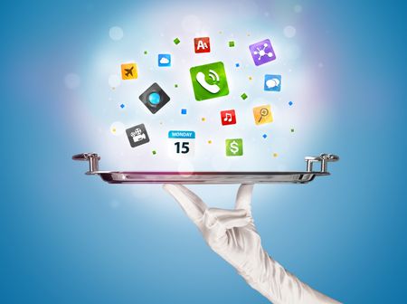 A stylish waiter hand with white gloves holding a silver plate full of social media communication icons and symbols in front of blue background