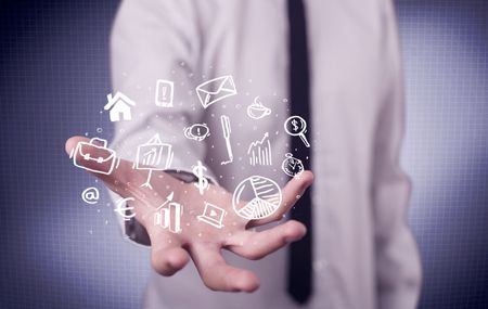 A successful business person has control over everyday tasks concept holding logos, icons in its hand with purple background