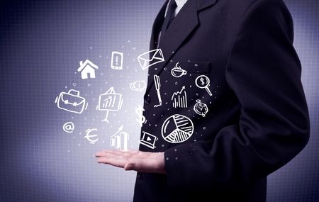 A successful business person has control over everyday tasks concept holding logos, icons in its hand with purple background