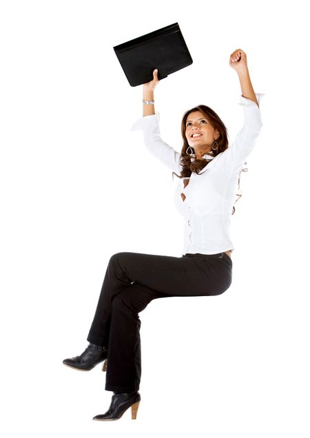 successful business woman with arms up isolated over a white background