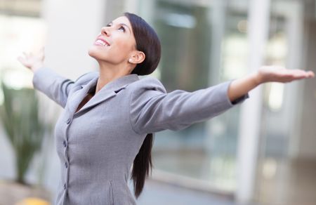 Successful business woman with arms open and looking up
