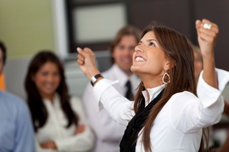 Successful business woman with arms outstretched at the office