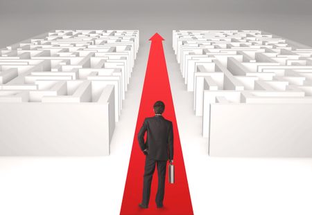 Successful businessman in front of a separated labyrinth, concept about simple solution