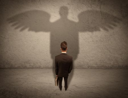 A successful businessman holding a briefcase is giving thumbs up for his angel shadow in front of a wall concept