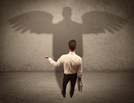 A successful businessman holding a briefcase is giving thumbs up for his angel shadow in front of a wall concept