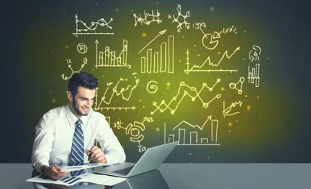 Successful businessman with all kind of hand-drawn business diagrams in background
