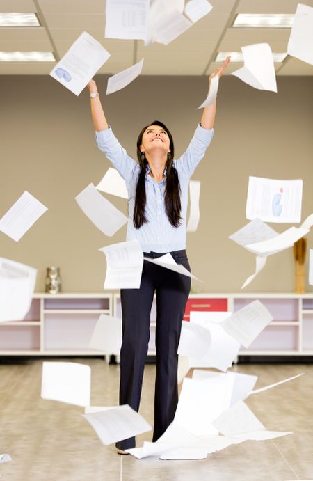 Successful businesswoman throwing papers in the air