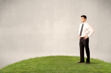 A successful caucasian elegant business man standing in small green grass with briefcase in front of clear empty background concept.