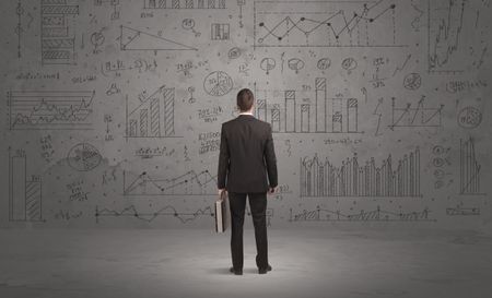 A successful confident businessman thinking about decisions, standing in front of wall full with graph pie charts and calculations concept