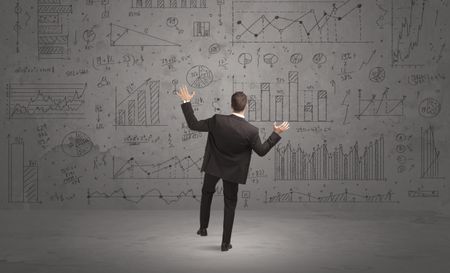 A successful confident businessman thinking about decisions, standing in front of wall full with graph pie charts and calculations concept
