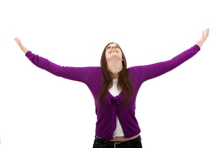 successful girl looking happy with her arms up isolated