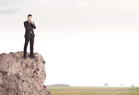 A successful good looking business person standing on top of a high cliff above country landscape with clear white sky concept