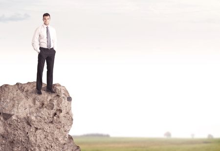 A successful good looking business person standing on top of a high cliff above country landscape with clear white sky concept