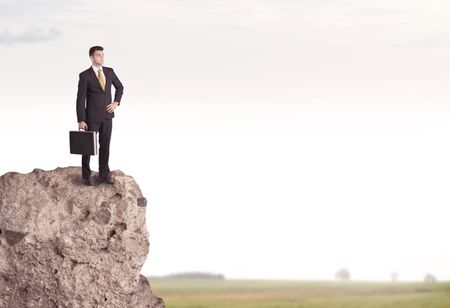 A successful good looking business person standing on top of a high cliff above country landscape with clear white sky concept