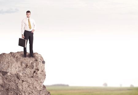 A successful good looking business person standing on top of a high cliff above country landscape with clear white sky concept