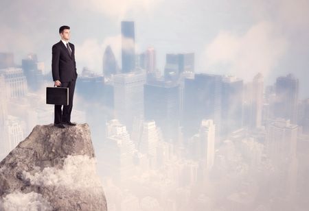 A successful good looking businessman standing on top of a high cliff above the city scape with clouds concept