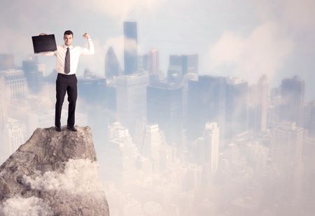 A successful good looking businessman standing on top of a high cliff above the city scape with clouds concept